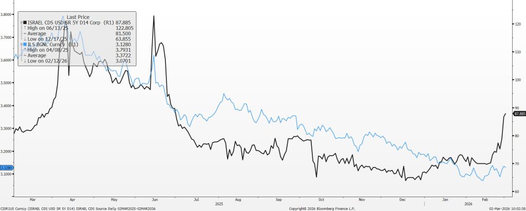 העלייה באי -הודאות הגיאופוליטית ברקע החשש מעימות עם איראן, הובילה בסוף פברואר לעליית פרמיית הסיכון של ישראל. עלייה זו התבטאה הן במחירי ה- CDS (Credit Default Swap) והן בתשואות האג"ח הממשלתיות של ישראל. גורם זה היווה משקל גבוה בהחלטתו האחרונה של בנק ישראל להשאיר את הריבית ללא שינוי, בשיעור של 4% לשנה . אמנם בנק ישראל ציין בסיפוק רב שהתפתחות האינפלציה השנתית והציפיות לאינפלציה מהמקורות השונים מצביעות על הימצאות סביבת האינפלציה מעט מתחת ל- 2% שהוא אמצע תחום היעד, אולם מערכה צבאית עצימה מול איראן ושלוחותיה עשויים להוביל לבעיות היצע, עלייה חדה במחיר הנפט וכנגזרת מכך לעלייה מחודשת של האינפלציה ולעצירת הפחתות הריבית.